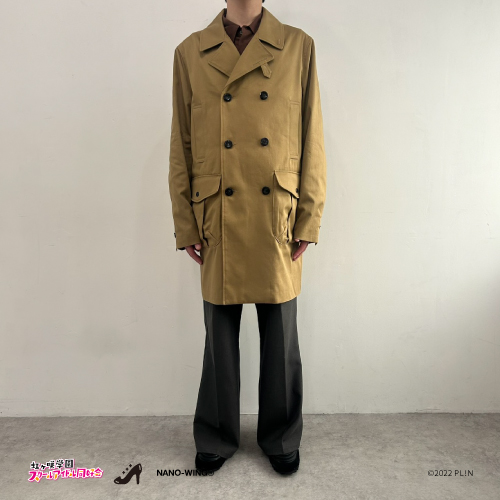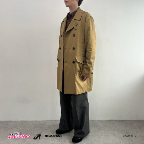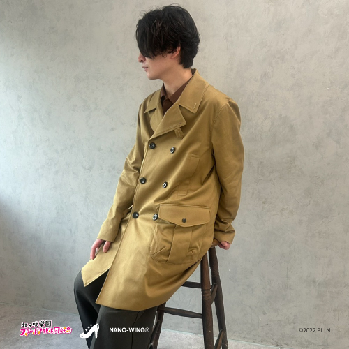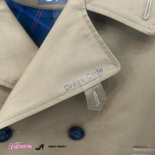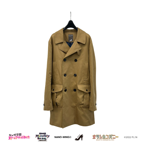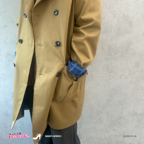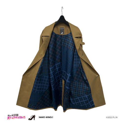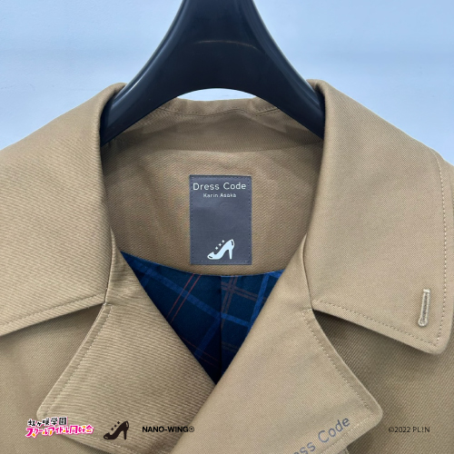 朝香果林「Dress Code」リリース記念アイテム。CDジャケットで果林が着用している衣装とリンクしたトレンチコートが登場。秋の街並みに映えるキャメルのトレンチコート。シンプルなデザインとは対照的に、裏地には衣装のスカートとリンクするチェック柄を配置。イメージカラーのブルーをメインカラーとし、上品さと遊び心を両立させました。襟元にはさりげなく楽曲タイトル「Dress Code」を刺繍。首元には果林のアイコンをあしらったネームタグを縫い付け、シンプルながらも鮮やかなブルーに映えるデザインで仕上げています。
